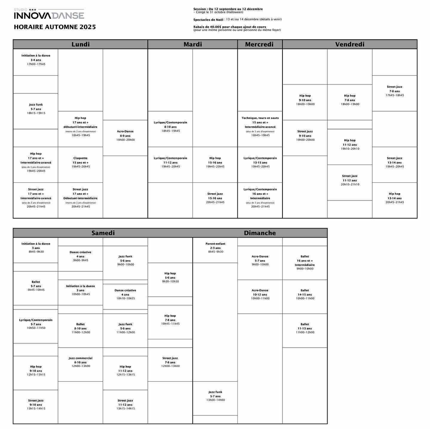 Horaire de cours de danse pour la session d'été 2026 à venir